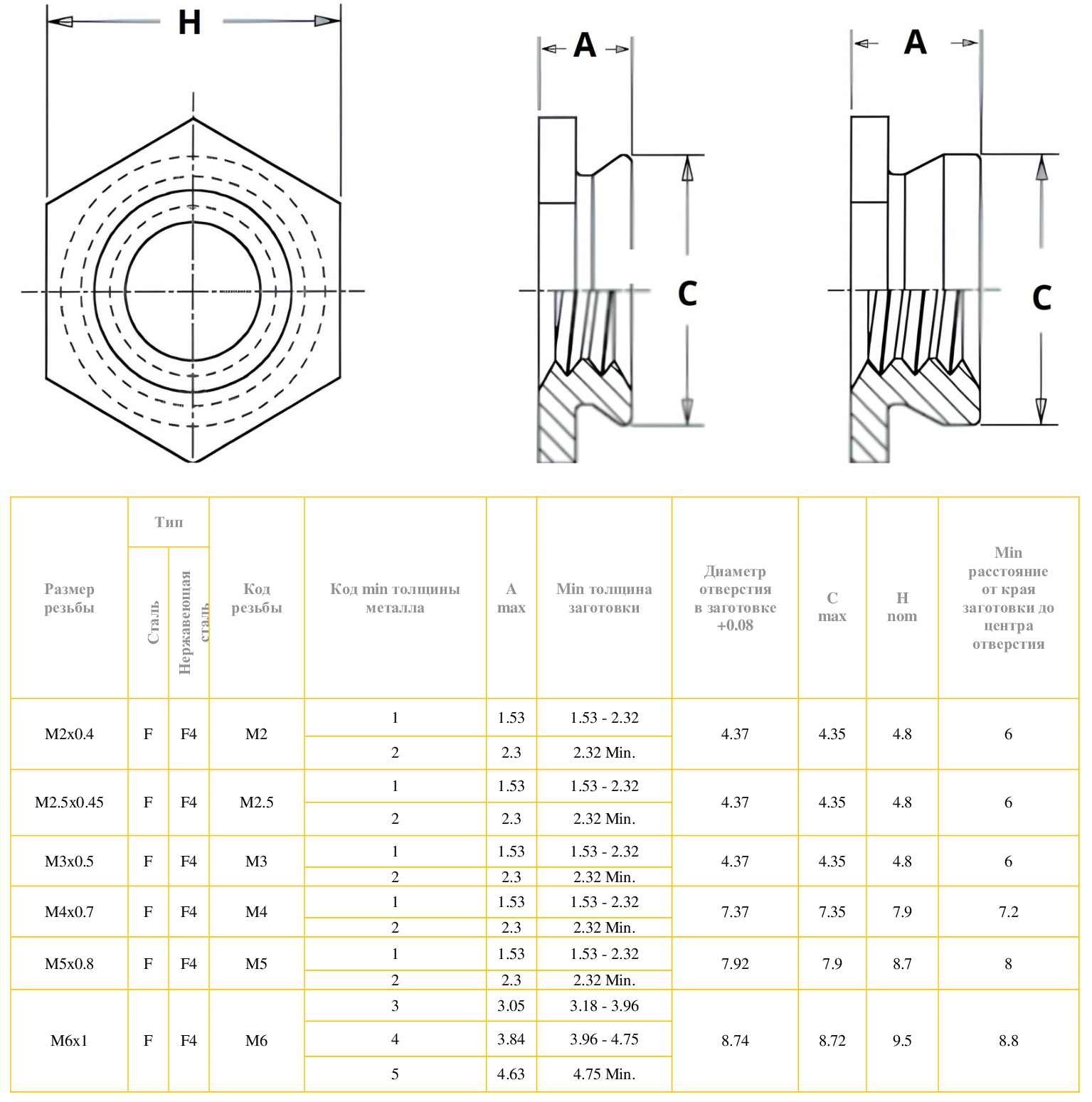 Низкая шестигранная запрессовочная гайка тип F из нержавеющей стали AISI 303 для установки заподлицо с обеих сторон заготовки толщиной от 1,53 мм. Идеально подходит для создания резьбового соединения в тонколистовом металле без выступов на обеих поверхностях заготовки, улучшает функциональные и эстетические свойства изделия. Может быть установлена в заготовку, подвергающейся последующей гибке или формовке. Шестигранная головка в сочетании с самозажимной конструкцией обеспечивает высокую осевую прочность и прочность на кручение. Имеет хорошую устойчивость к коррозии. Размерность от М2 до М6. От двух до трех вариантов высоты обратного конуса гайки в каждой размерности, выбор которого зависит от толщины материала, в который будет запрессовываться крепеж. Рекомендована для монтажа заподлицо в заготовки из углеродистой и нержавеющей стали твердостью до HRB 70 и толщиной от 1,53 мм.
