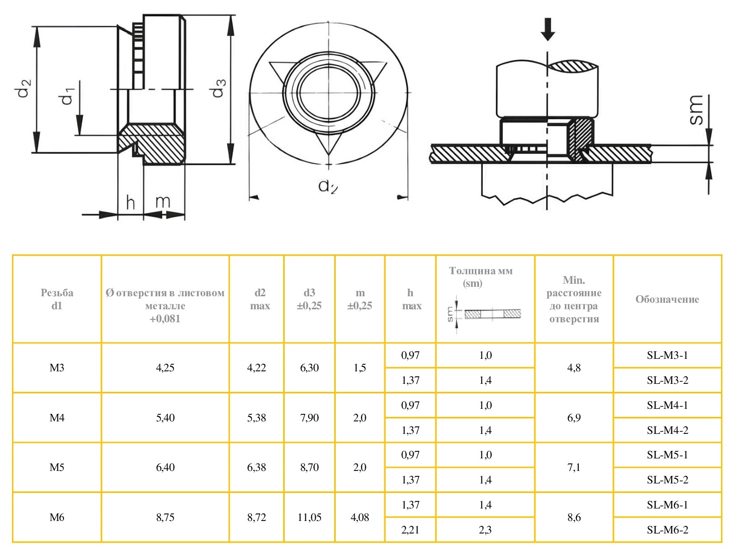 Запрессовочная гайка SL относится к самоконтрящемуся крепежу с преобладающим крутящим моментом, т.е. в процессе затяжки обеспечивается практически одинаковый крутящий момент независимо от величины прилагаемой осевой нагрузки. Размерность от М3 до М10, два варианта высоты обратного конуса, выбор которого зависит от толщины материала, в который будет запрессовываться гайка. Рекомендована для монтажа заподлицо в стальные и алюминиевые заготовки твердостью до HRB 80 и толщиной от 1 мм.